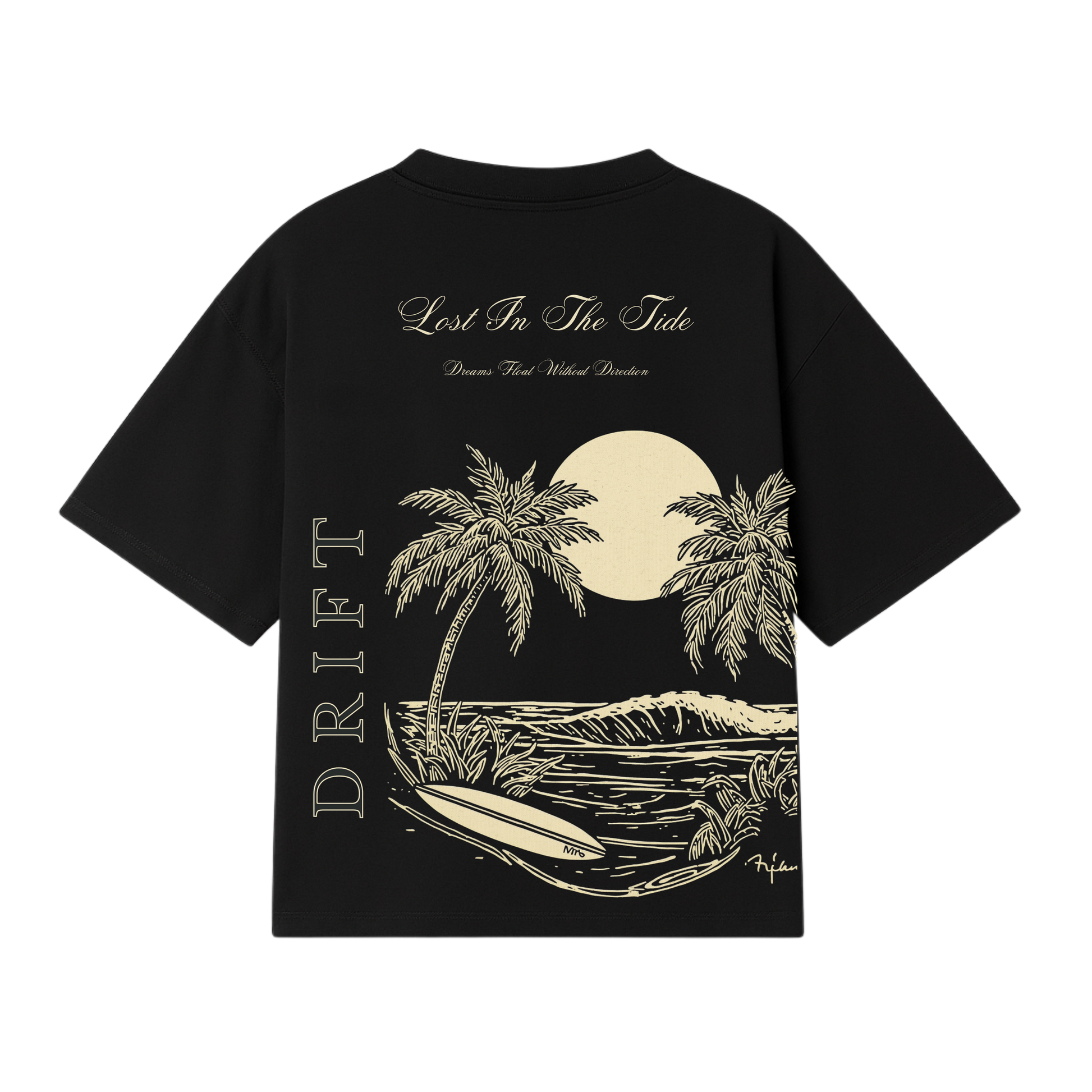 Diseño inspirado en la calma nocturna del mar. Palmas, luna llena y olas que evocan la libertad de dejarse llevar.